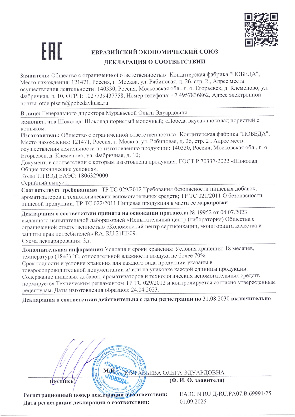 ЕАЭС N RU Д-RU.РА07.В.69991-25 Шоколад пористый молочный, пористый с коньяком Победа вкуса до 31.08.2030_page-0001